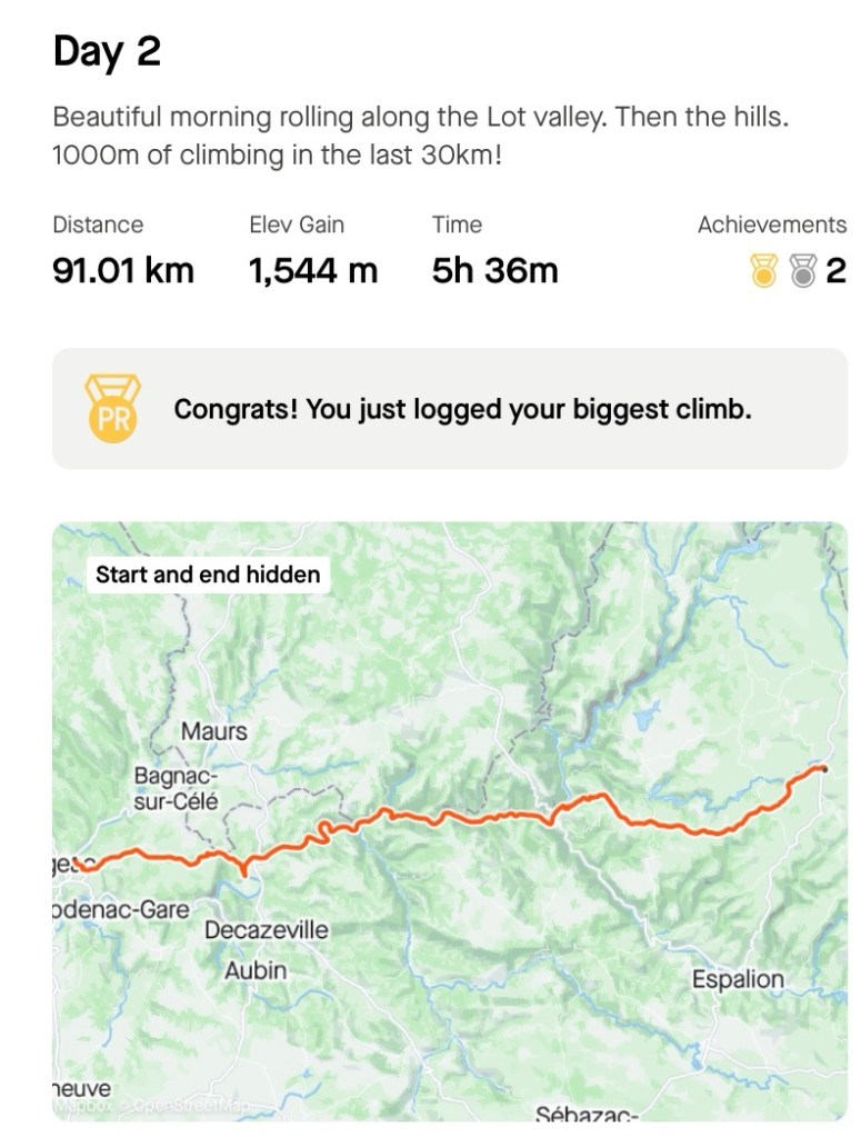 The route from there down the Lot valley was stunning, passing through pretty villages and gently undulating beside the river, with shelter from the headwind which lulled me into a false sense of fitness. Then came the hills.