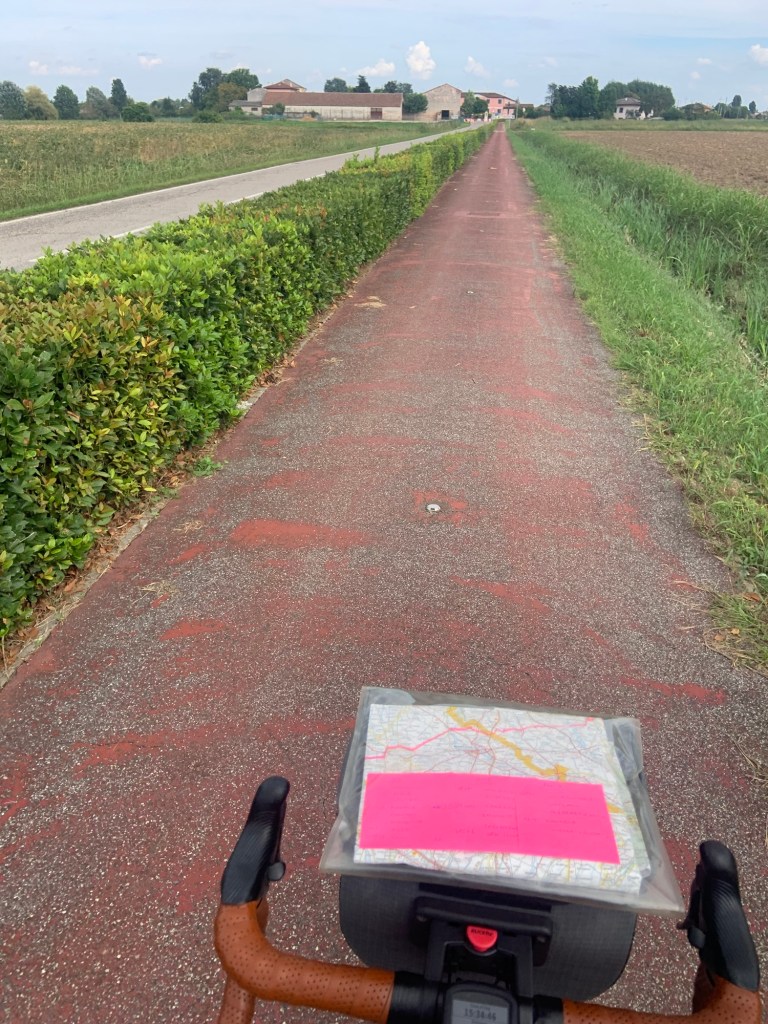 More flat roads and cycle tracks today. Not as far to go, so a slightly later start. The whole of the swathe of the Po floodplain across the north of Italy is so flat it reminds me of my time-trialling days. I’m surprised there isn’t a big TT scene here! That said, there were hills on the horizon today.