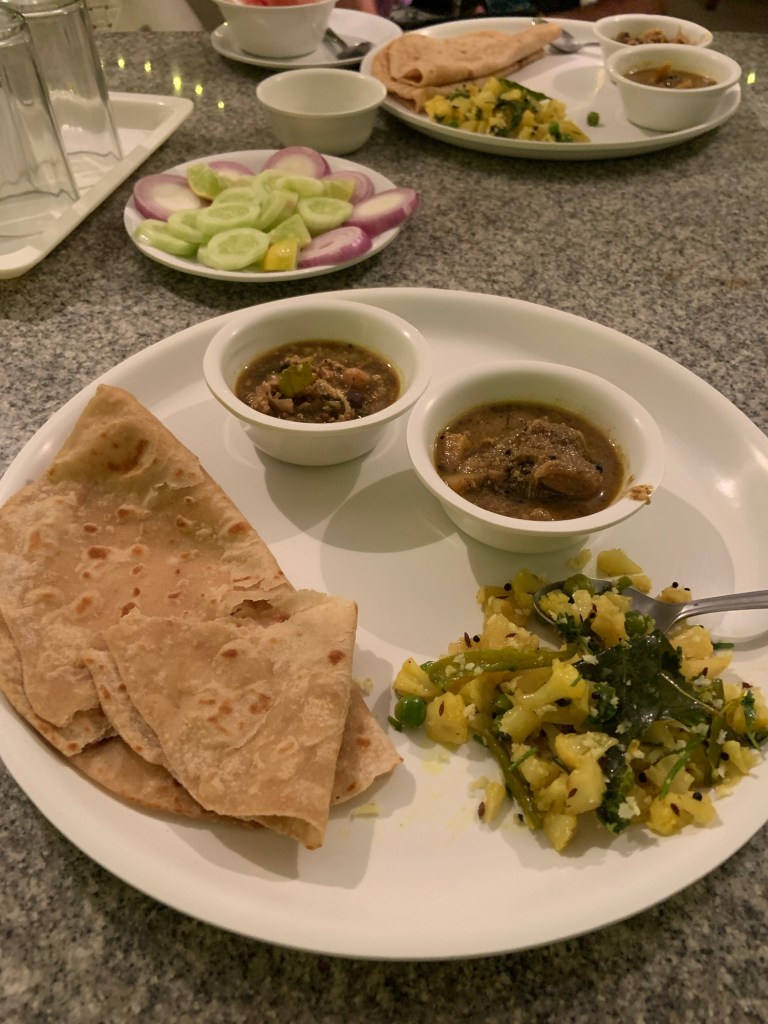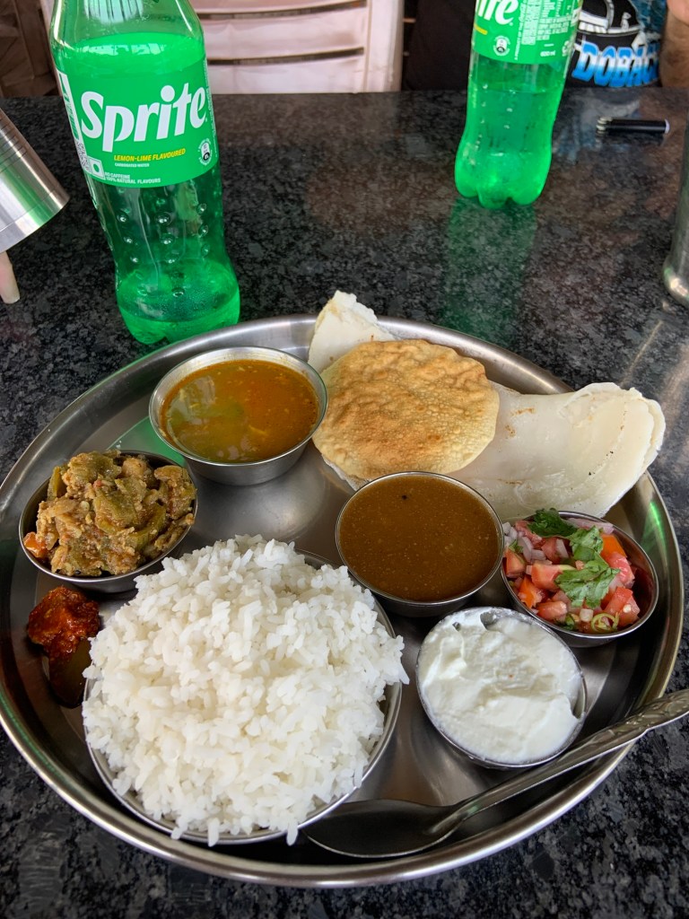 The change of plan included stopping around midday for a couple of hours, which is what we did. A roadside restaurant provided welcome cold drinks and vegetable thali, an assortment of dishes with rice. The second in a couple of days and very good.