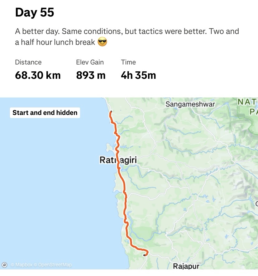 Overall, a much better day on the bike. I’m resigned to doing shorter distances and taking my time. I also feel like I am acclimatising more each day, which is to be expected. The train option may be taken later, across some of central India depending on conditions and accommodation availability – but that was always part of the plan!