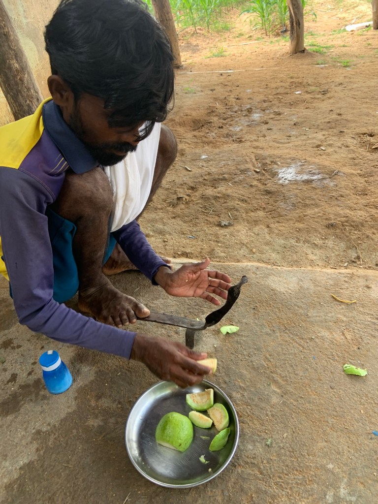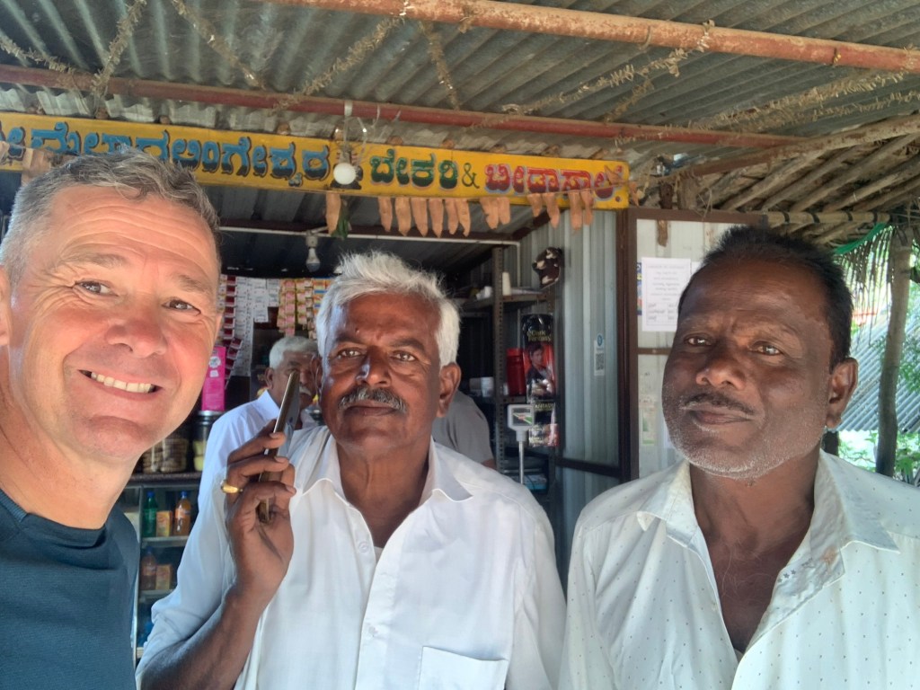 When I was about 10 kilometres from Challakere, my target for the day, a couple of guys on a motorbike made drinking gestures at me (if that makes sense?). Over the last few days, in addition to the usual ‘which country’ question, I have been offered bottled water and fruit from motorcyclists which is really kind, and quite humbling. These two today though went a couple of hundred metres up the road and stopped in an entrance, then beckoned me across. I’m normally very cautious, but went along as my gut feeling was that they were genuine. I was right. They sat me down, one of them cut up some guava (with a particularly rusty looking blade) and shared it with me whilst the other went across the field to a palm tree and picked two coconuts. We shared fresh coconut milk and some of the coconut itself. They even offered to charge my phone. After a round of selfies (obviously), I went on my way, not before offering some rupees for the refreshments, at which they looked horrified. It’s difficult to know what to do, and not insult people sometimes.