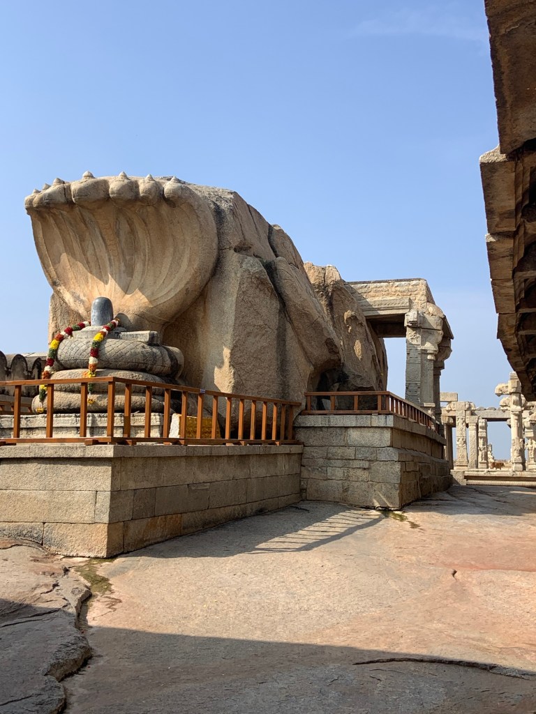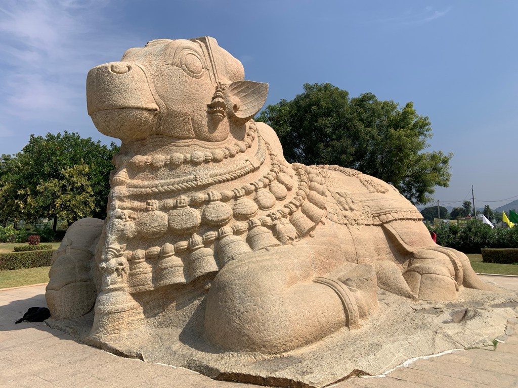 After half an hour in the temple, I went looking for one of the other sights of Lepakshi – a monolithic bull. I found it, right next door to another hotel. This one was more reasonably priced and a bit cleaner. Having booked in, refreshed myself, and had a cup of tea, I went on the tourist trail again. The monolith is a seated representation of Nandi – the bull incarnation of Lord Shiva. Again, an impressive carving (6m high, 10m long).