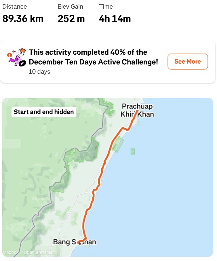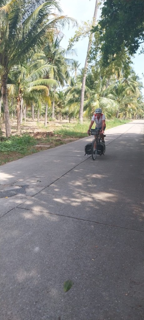 Lunch was in a great little roadside stall, and we stayed out of the sun for a while before pressing on over the undulations to Chumphon, where Steve had found a lovely place for us to stay. I feel a bit guilty because I got a little bungalow and he’s in the hotel building. We thought mine was more expensive, but turned out not really so. Just before we got there, we passed a brilliant cycle shop, so I popped in to check it was open tomorrow as I need a couple of bits. It stocks Colnago, Trek, and other high end bikes and components, which seems a bit out of place in this town.