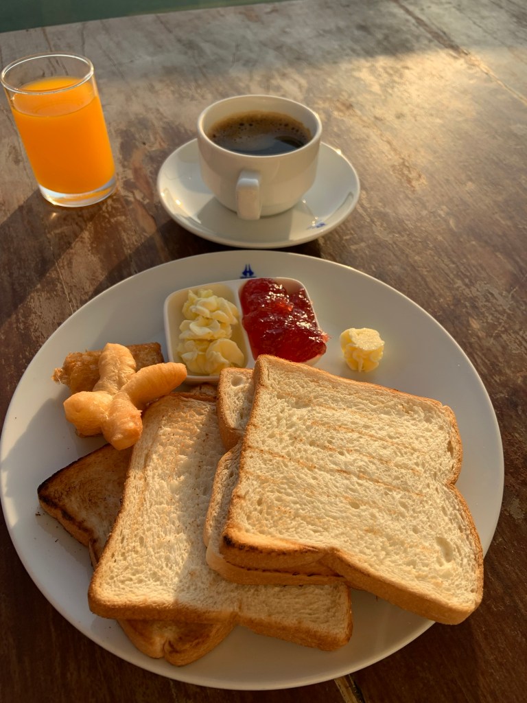 By the time I got up it was raining. Tropical raining. If it wasn’t for my toe which is still giving me grief, I would have run to the restaurant to meet Steve for breakfast. I got a bit wet instead, but at least it isn’t cold.