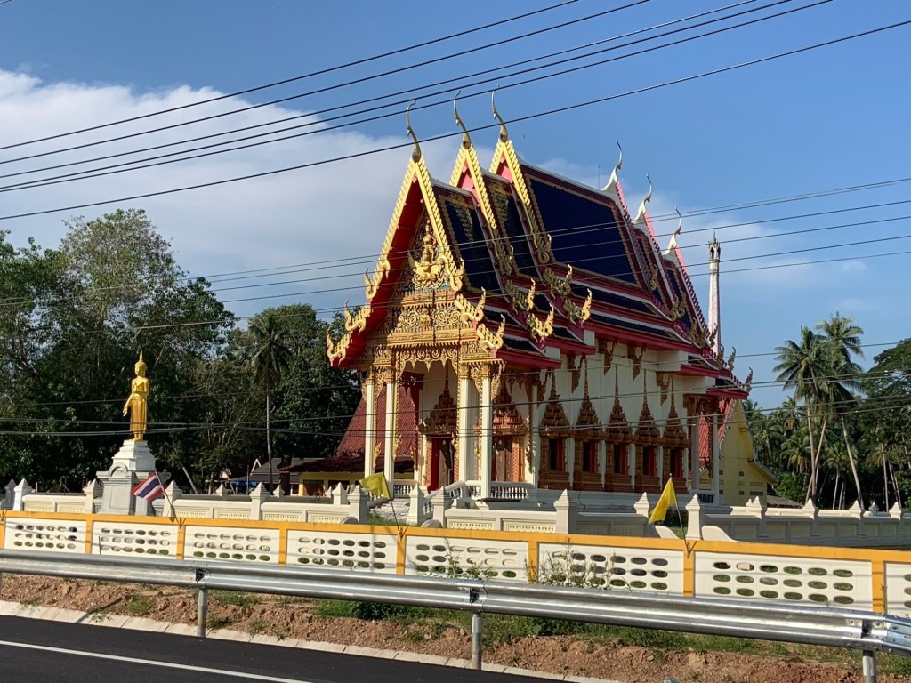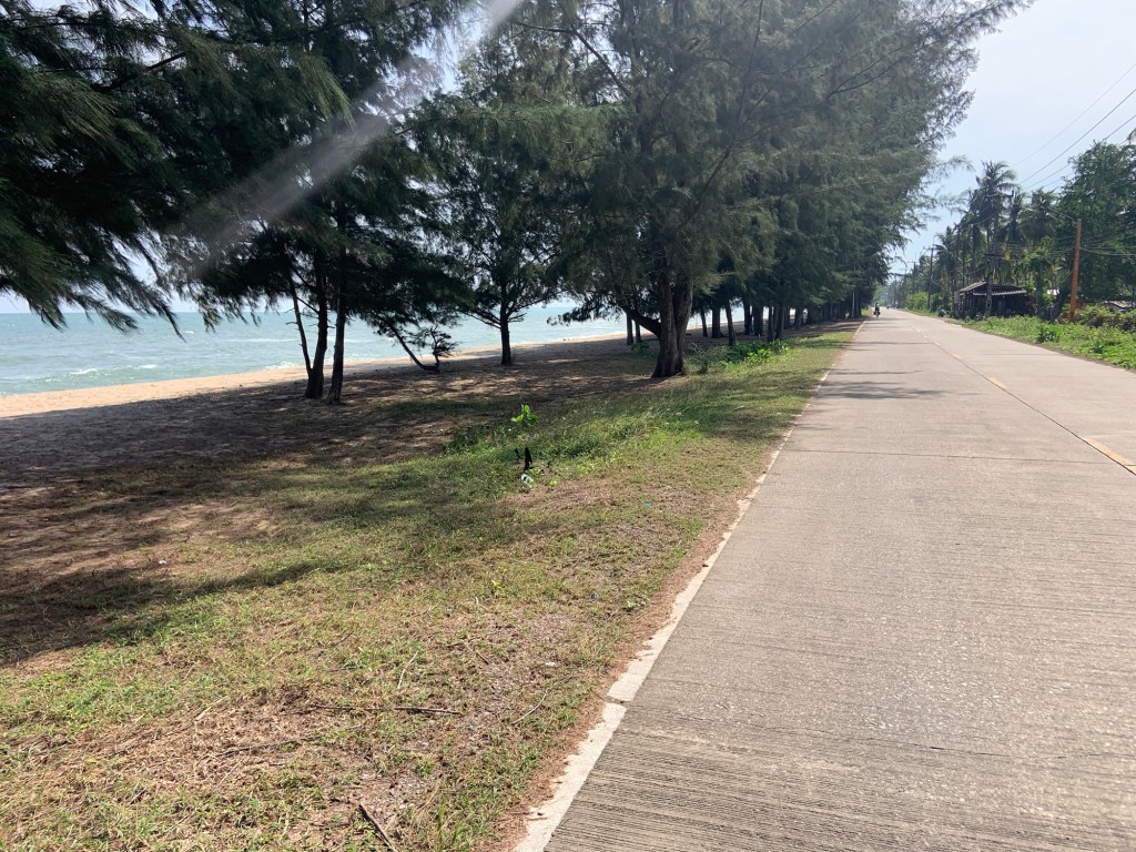 Lunch was at a nice little roadside stop (chicken fried rice again), where we met three English cycle tourists on a similar trajectory to us. They left shortly before we did and we haven’t seen them since. Yet. We drifted across to the coast, then followed it almost all the way to our destination – Bang Saphan. The roads and views continued to impress.