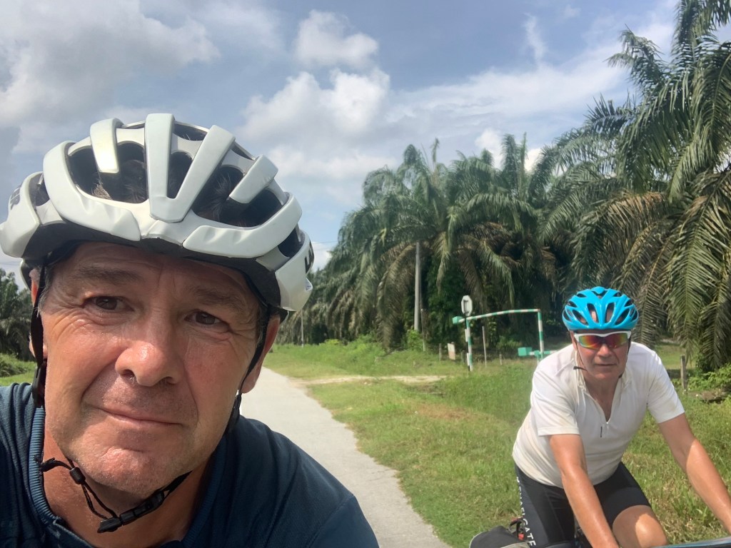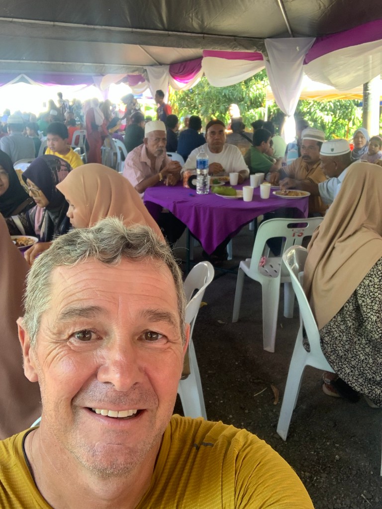 Our day then took a turn which we were not expecting, and made it even more interesting. We were confronted by a cone in the middle of the road which seemed strange. Around the next bend was a chair blocking our way. Even more strange. We then found out why, as all of a sudden the road was completely blocked by a marquee, set out with tables and chairs and a couple of hundred people milling about, some standing, some eating and some being served. Instead of turning around, we decided to try to get past what was obviously a celebration of some kind. Whilst being helped by people moving chairs out of our way, I asked what the occasion was, to be told it was a wedding. The family of the groom for some reason thought it a good idea to invite two sweaty middle-aged cyclists to join the celebrations, and eat with them. It would have been rude to refuse. The food was excellent; rice, chicken, ‘meat’, pickles, vegetables, desserts, although we restricted ourselves to a polite amount. In some respects the food was incidental, as the atmosphere and just the privilege of being there was more important. Being at a Malaysian, Muslim wedding was not something I had anticipated I would do. Ever.