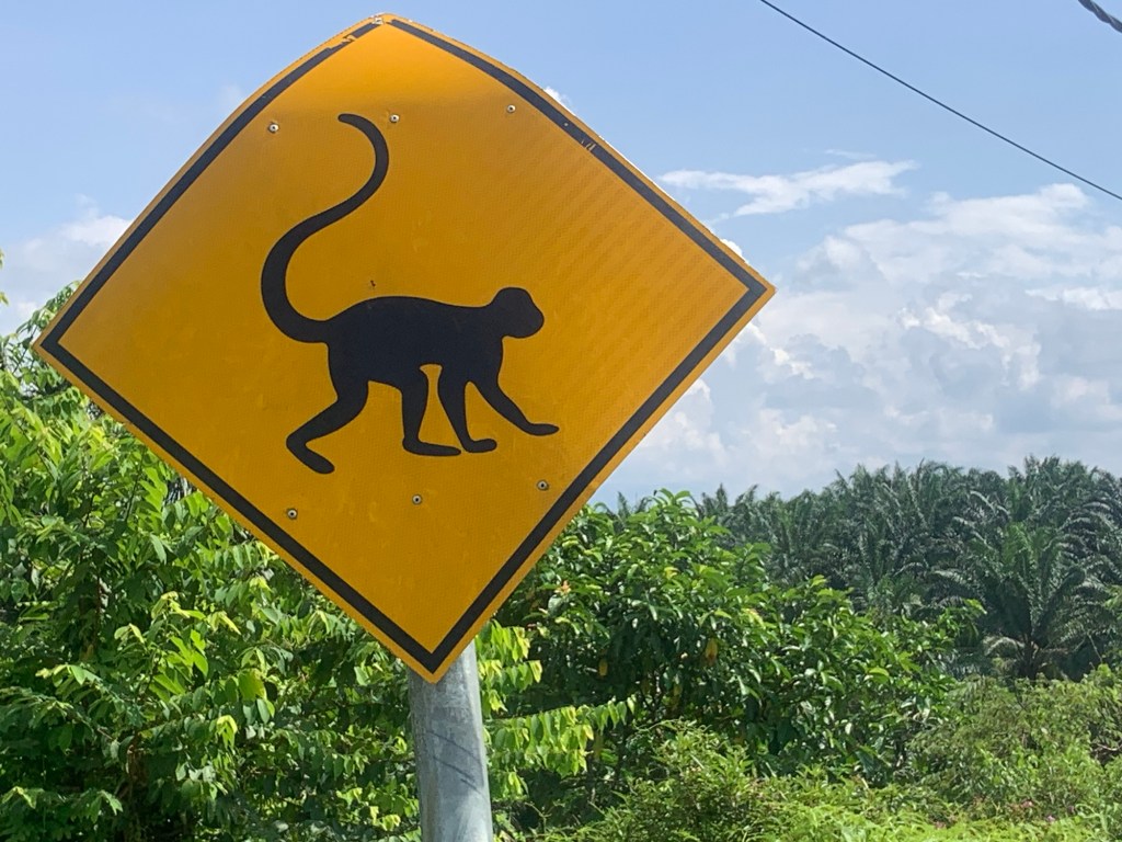 The roads got even better. In moving away from the coast we were entering slightly hillier terrain with primary rainforest (jungle) interspersed with palm plantations. There were lots of long tailed macaques around, a troop of them chilling in the shade of palm trees, and a few family groups at the side of the road. I also saw several small-ish monitor lizards on the grass verge and crossing the road.
