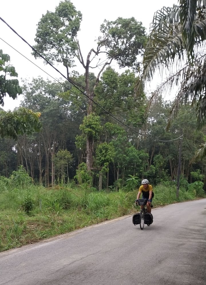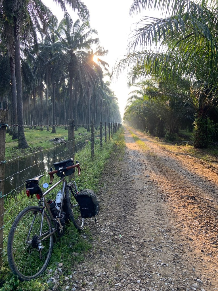 This morning was a big of a repeat of yesterday. Up early; bread roll and coffee in the room; on the road before 0800hrs. The route out of town was simple, as we just followed the main road for a few kilometres until we hung a left and cut across country – a nice little route that Steve had found. It took a little bit of start-stop navigation, but was worth it for the quiet roads and scenery. Cycling through the oil palm plantations has a distinct feeling of tranquil and exotic. The downside though is the lack of wildlife. When we hit patches of rainforest, there are monkeys, lizards and snakes. When we transition to the plantations it disappears, save for the bird life and occasional monkey. The destruction of natural habitat couldn’t be more obvious.