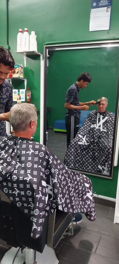 A hundred metres away was a great restaurant. Steve had noodles, I had rice. Both with chicken and prawn crackers (and iced tea). Best meal I’ve had for a while. A few doors down was a barbers with no queue. Haircut sorted for the princely sum of £2.67. More expensive than India (my last haircut), but worth the money.