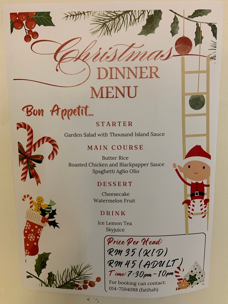 Then came Christmas dinner. What can I say. The way it was advertised made it seem like a good option, so we went for it (despite having seen a large rodent run across the restaurant). The reality was different. Very different. Basically we had a bit of lettuce, followed by a chicken drumstick and some rice with a black pepper sauce. There was then some cheesecake, or more accurately a cake made with cheese (not that there was any hint of cheese in it). After we had eaten, the pasta appeared (along with some garlic toast – one of the best parts of the meal). Better late than never. It will go down as a Christmas meal that I will never forget.