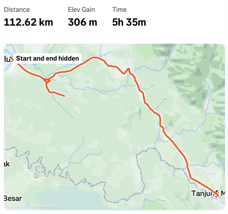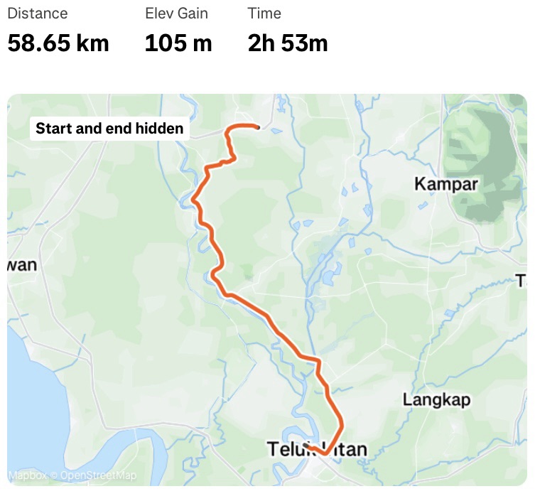 Once we were past a section of Steve’s favourite gravel, and back on the main road, we stopped for a spot of nourishment. I really didn’t fancy the spicy prawn or chicken, so opted for a fried egg with my rice and iced coffee. I also had to wring my t-shirt out again. Back on the bike, I did feel better for not eating too much. We then basically followed the main road all the way to Teluk Intan. With a few kilometres left to go, we needed another stop for water. Just prior to the petrol station we stopped at I heard an ominous ping from my back wheel. I’ve no idea how or why, but I’d broken a spoke. Bizarre, as I wasn’t pushing a big gear, going uphill, or anything which I would have said created enough torque to snap it. I can only assume that it was just wear-and-tear, plus some of the rough terrain I’ve ridden over the last few months. Fortunately it was on the non-chain side, so changing it wasn’t too much hassle, although I still had to bend the new one far more than I would have liked in order to thread it through the hub. The wheel has trued up quite well, but I’m now nervous about the rest of the spokes and whether the wheel will need re-building before I do much climbing. Bugger.