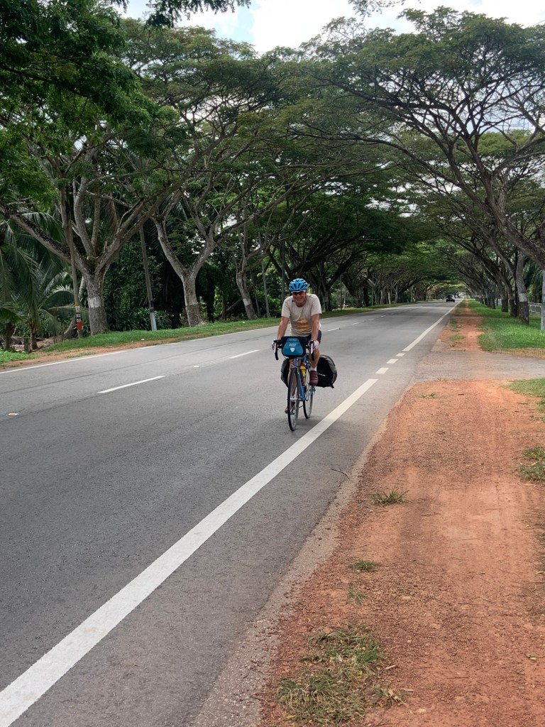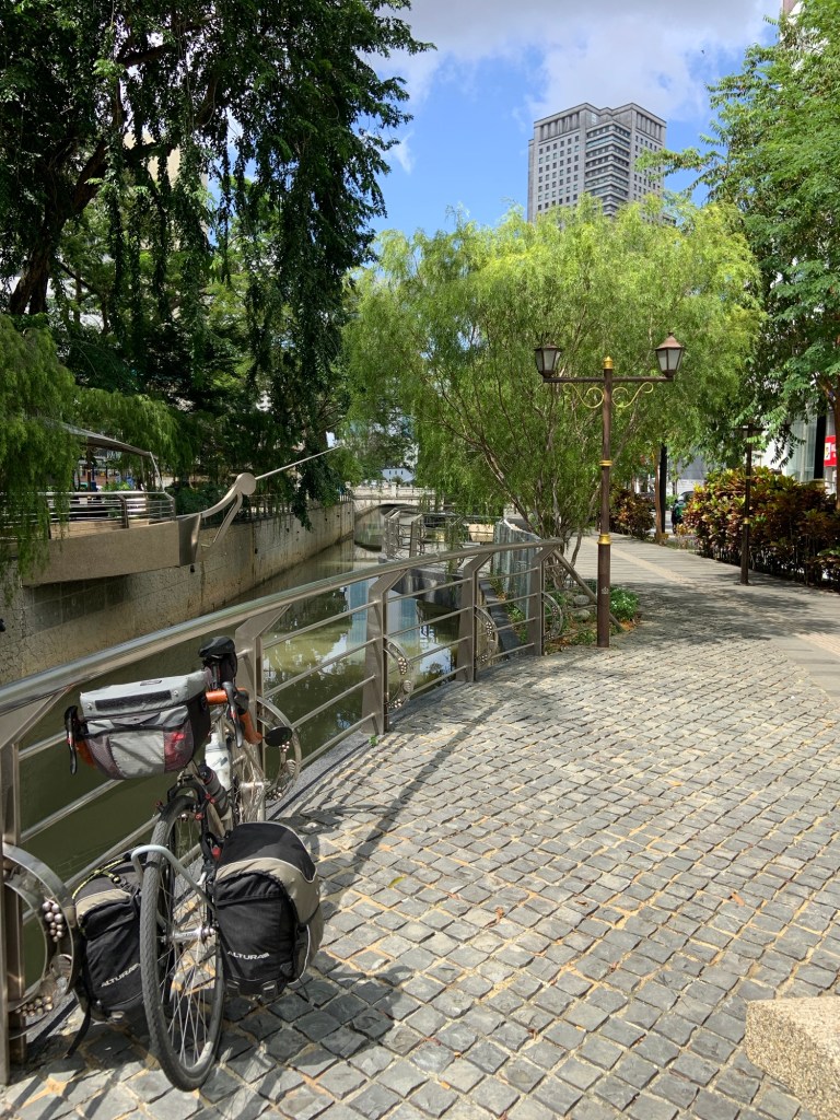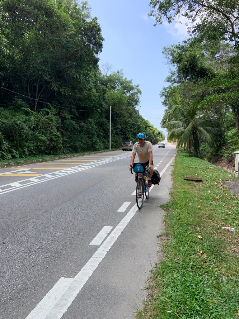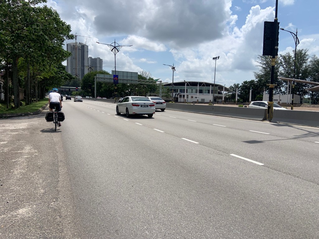 From thereon in the traffic steadily built up. At a welcome stop for a coffee (not a great one) we looked at our route into Johor Bahru. The one-way set-ups and lack of possibilities for cyclists was frustrating, which, when we were back on the road caused me to fall out with a lorry driver and his bullying tactics as we were trying to avoid getting on a motorway. I wasn’t very polite. He possibly learnt some new English words. We found a track which led to a motorway services access road, and then had no option really other than the big dual carriageway. Fortunately, being a Sunday, it wasn’t as busy as it could have been. It was a bit like being in a video game; concentration, lane changes, fast cars, slip roads. A burger, coke, and McToilet stop provided 10 minutes of respite and a reset before the last 14 or 15 kilometres of madness.