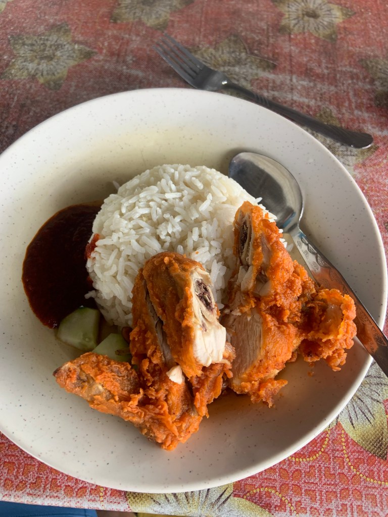 Second breakfast was at Senggarang at about 30km. Rice and chicken as usual, with a spicy sauce, peanuts and anchovies. Nice, but a bit more than I needed at 1030 in the morning.