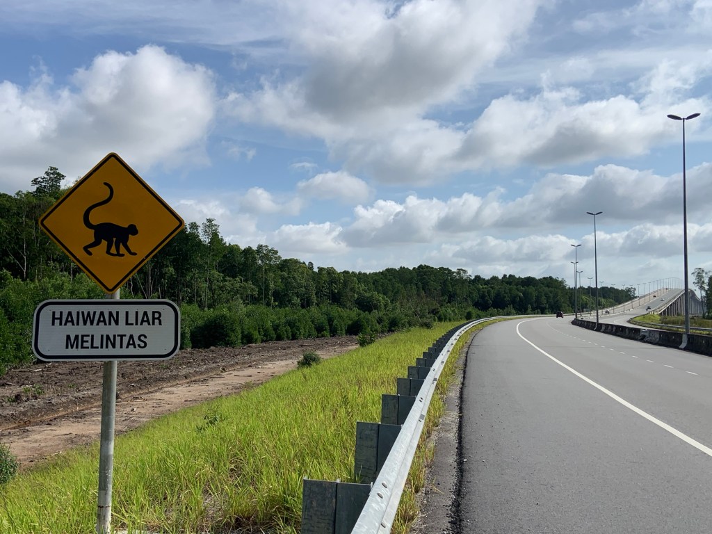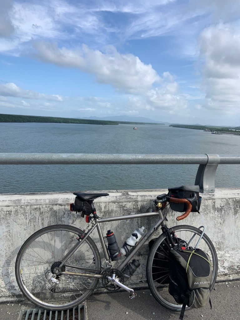 We could have taken the easy route along the main road, of around 57km. We opted instead for a quieter approach to Johor with minor roads for at least part of the way, but a few more kilometres. It was nice to have a last ride on some country roads before hitting the city traffic, and see the monkeys at the side of the road for one last time. We were a bit early for the food stalls to be up and running, so our standard coffee stop had to wait. After 30 or so kilometres of wiggling about, and failing to get a photo of a pineapple stall, we turned onto the aptly named Johor Bahru – Pontian Bridge Road, which was immediately a dual carriageway with a block headwind. There was very little traffic, but lots of cyclists which was nice to see. A few minutes later we were at the bridge, probably our biggest climb of the day.