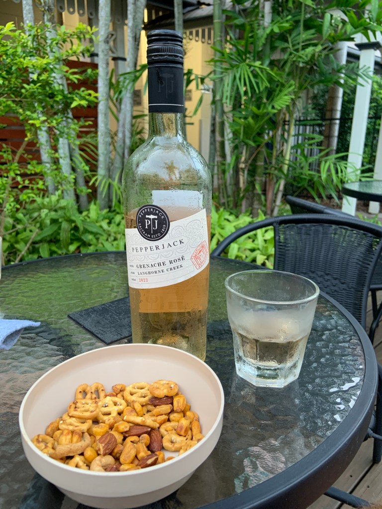 We stopped on the seafront for a coffee/coke and to soak up the atmosphere, then walked past the great big (and popular) lido with a beach where loads of people were swimming and cooling off. At the marina itself we found the jetty where we need to be tomorrow, and spoke with a lady in the office to confirm timings and locations. A steady walk back and then past the hotel took us to a small supermarket where we bought a bag of nibbles, some plums, and a bottle of water. The hotel supplied a bottle of rosé, perfect for us to sit outside for an aperitif. It was the first glass of wine I’d had since Ljubljana. I enjoyed it very much. We were accompanied by fruit bats (flying foxes) by the dozen. They are massive – about the size of a crow. They put the pipistrelle bats at home to shame.