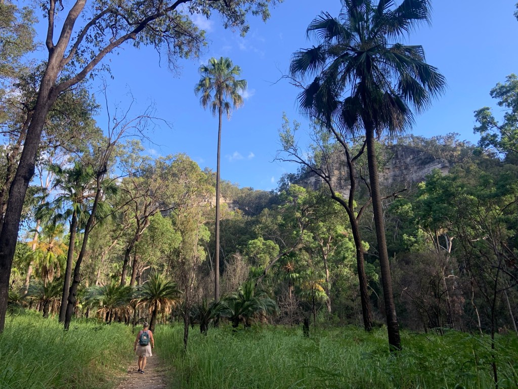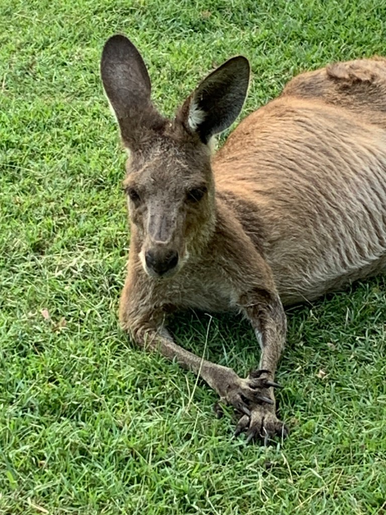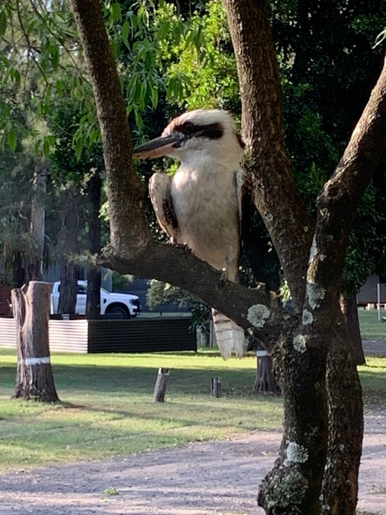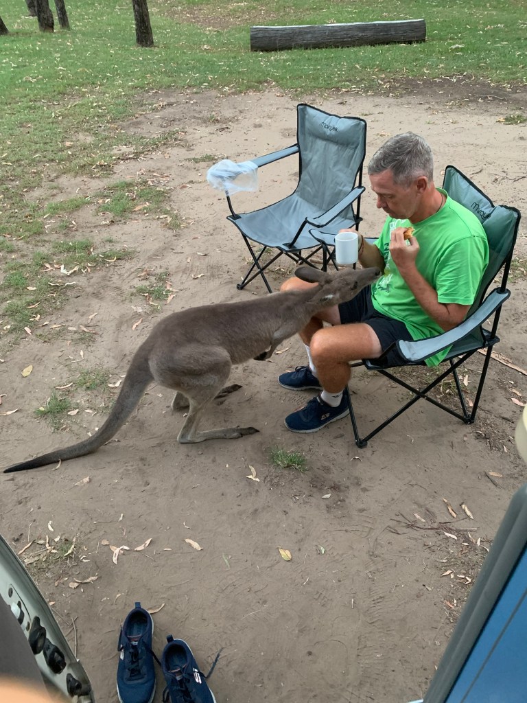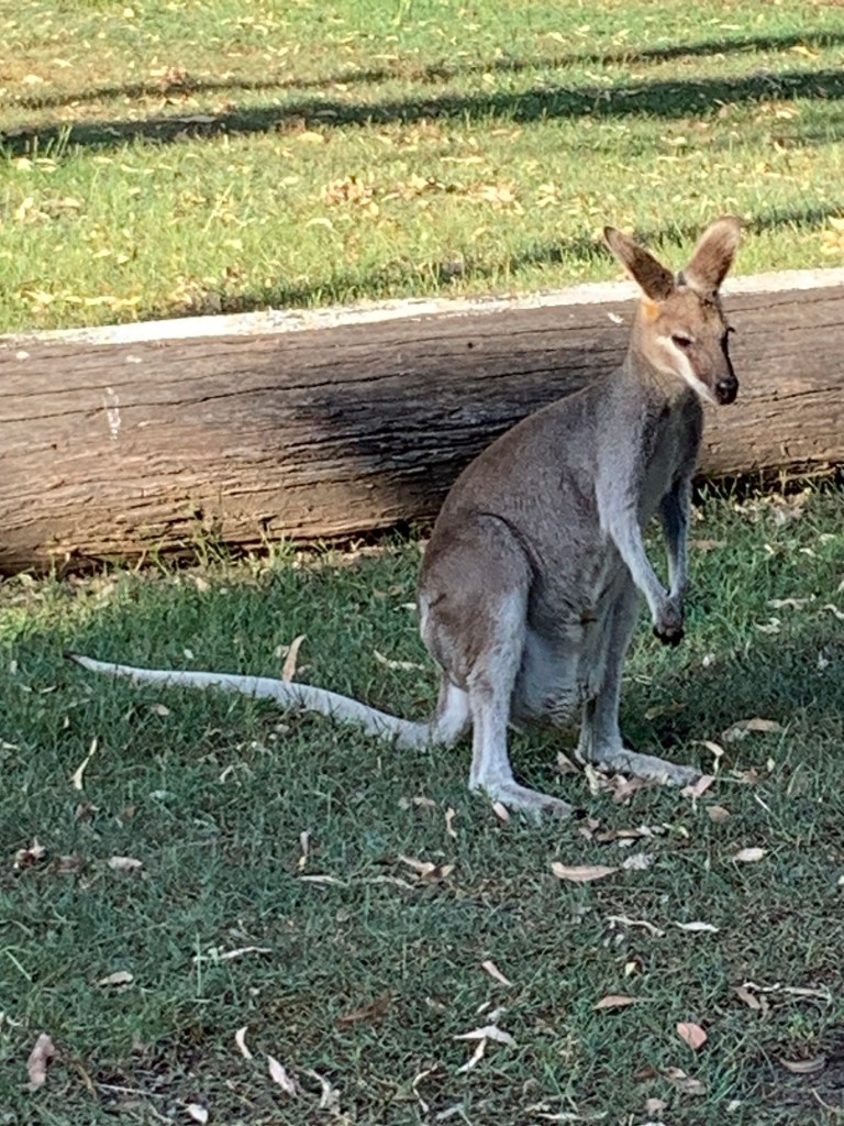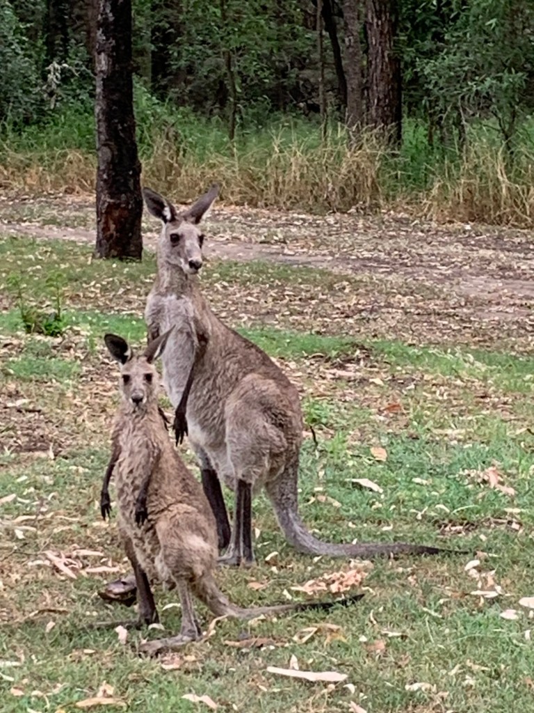 For the last 40km as we approached the National Park the scenery got more interesting, culminating in a more tropical feel at the campsite where there are more palm trees than we’ve seen recently. The campsite is excellent; big pitches with enough shade, kookaburras laughing in the trees and lots of kangaroos who are clearly used to human presence as they graze on the grass on the pitches. They also pose for photographs (as do the kookaburras). Apparently there are also some platypus in the creek, but despite our best (quiet) efforts, we haven’t seen any yet. There is no phone signal at all. The WiFi near the office isn’t great either (ie doesn’t work), so we’re a bit incommunicado whilst we are here.