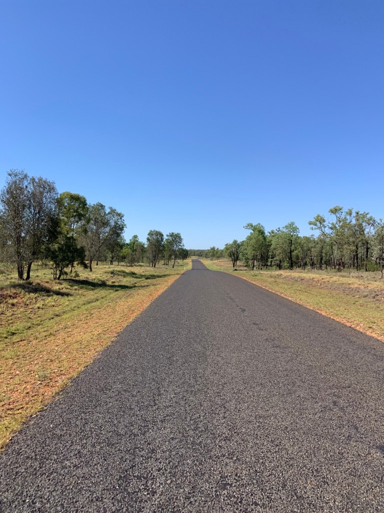The outback scenery continued until Jane caught up with me after about 25km, when we stopped for a bite to eat and a coffee. We were almost done when a young lady pulled up in a farm ATV with her two young children. Crystal was from the station (farm) we were parked on, and was just checking that we were ok. She then spent the next half hour chatting with us about our journey, and her life in rural Queensland. She offered tips on where to visit, and told us of the large numbers of kangaroos and emus in the area. What a lovely girl.
