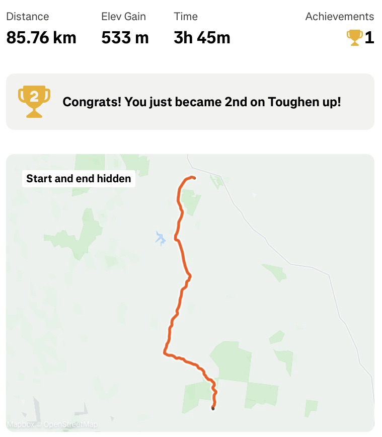Today was probably the best ride I’ve had so far in Australia. It warmed up this afternoon, but the rolling hills were great, long views even better, and to be off the highway was fantastic. Loved it.