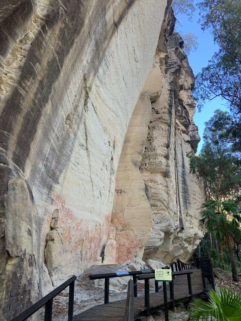 We opted for a 14km round trip (out and back would be more accurate). Therefore our furthest point was a place known as the Art Gallery. There are paintings on the cliffs made by First Nation people over the years (no date information supplied), using ochre to stencil around things (hands and boomerangs mainly), and also carvings. The whole gallery tells the story of life. Spectacular.
