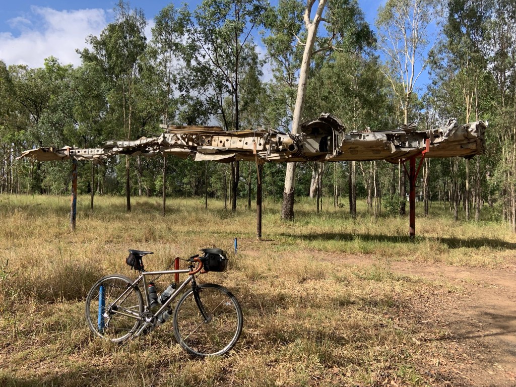 The road was undulating immediately, with some short sharp climbs meaning that I had gained 210m in the first few kilometres. It was pretty flat from there on, but was hard work before I’d really got going. I stopped off to look at the remains of a Dakota aircraft which crashed in 1943 in a storm, which was also the site of the Queensland police horse breeding centre in the early 1900s.