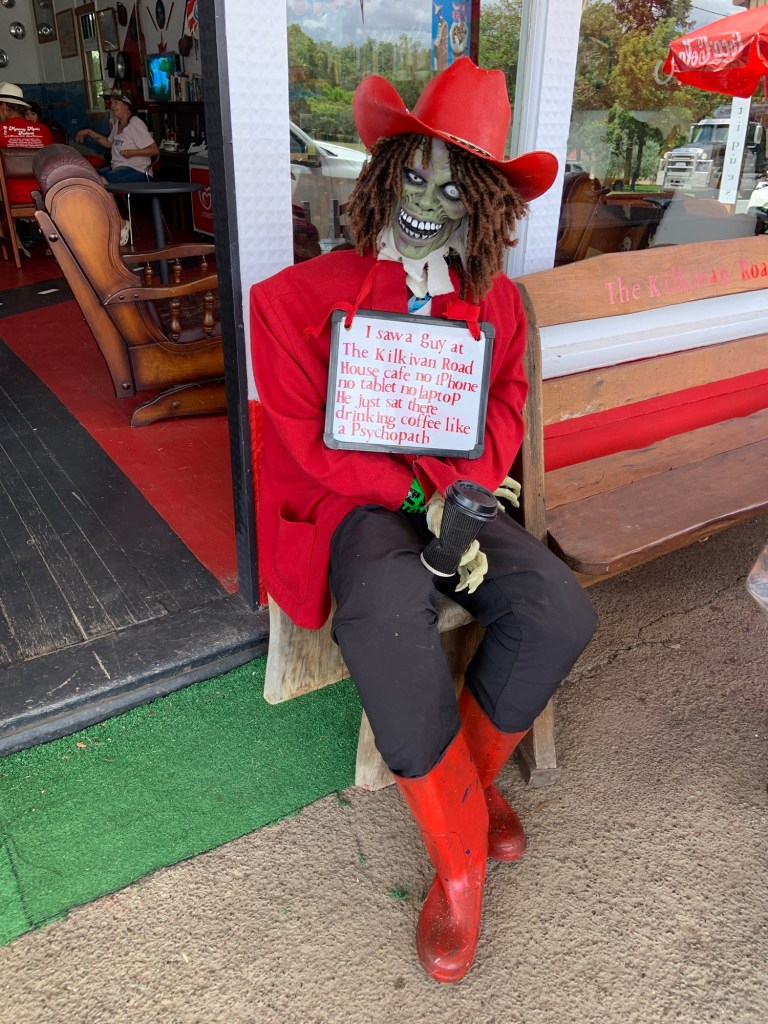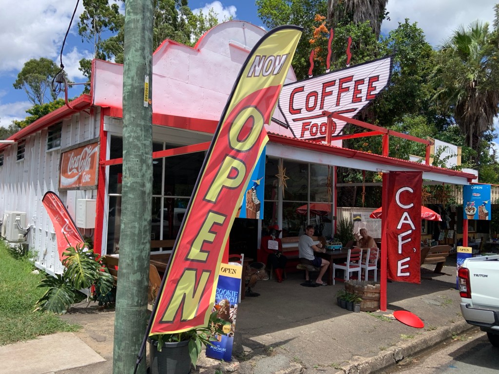 The ride in and out wasn’t wasted though. It was lovely to be on really small roads. Once back on the 49 the traffic gradually increased. We met up again after about 50km for a coffee in Kilkivan, a small village with a coffee shop and not much else. It was lovely. The coffee shop owner was great, and the banter started as soon as he heard our accents. He started the business three months ago as a way of meeting people, and said he didn’t need the money, or in his words – “I’m fackin’ rich. I’ve got fackin’ loads of money”. Brilliant. It is a bustling hive of activity in what otherwise appeared to be a quiet place. People coming and going all the time. One regular there, Lee, was particularly interested in our journey and sat chatting for ages. Really nice guy.