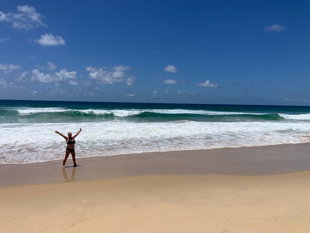 I carried on for a very short ride to our lunch stop at Yaroomba Beach. We found a viewpoint with some steps down onto the practically deserted sand and went for a dip. You couldn’t call it a swim because the breakers and undercurrent made it impossible and dangerous. Once out of the water and sitting on the beach we noticed the small bits of jellyfish dotted about. I think we were lucky to have got away without being stung. Jane lay in the sun for 20 minutes. She is now red. I did warn her.