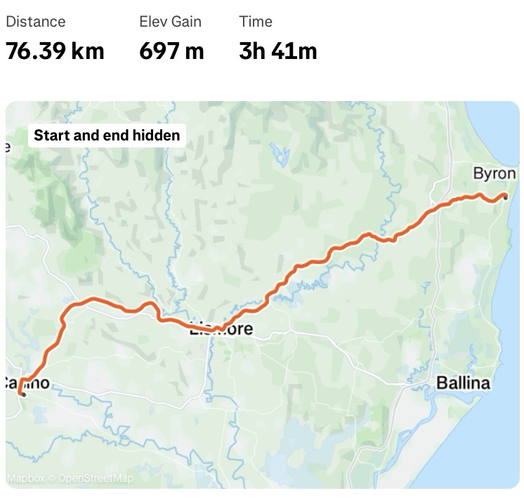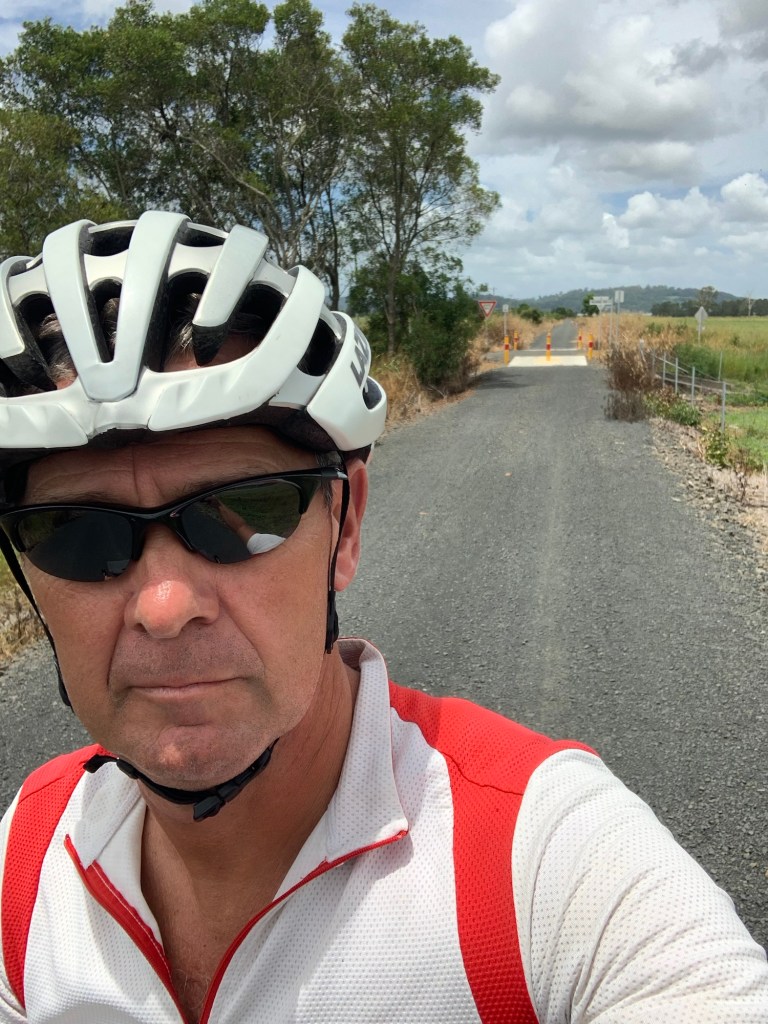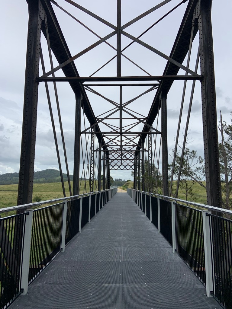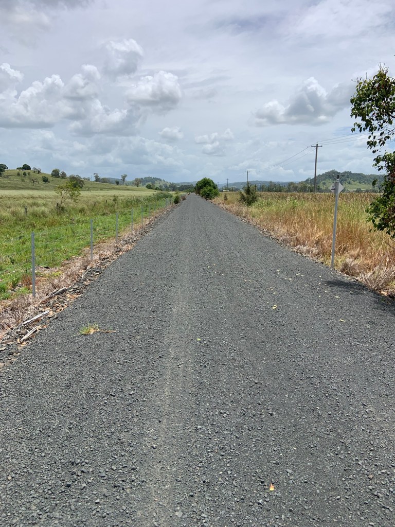 I met up with Jane after 25km in Clunes, at a really nice chilled out coffee shop. I tore myself away after 45 minutes, and headed to Lismore – bigger but not overly attractive. It wasn’t far, but we met again just past the town in a little side road where we had lunch in the shade of the van. The side road crossed the old railway line, which has been turned into a cycling and walking trail which is not shown on the map. When I set off, it was a theoretical 20km to Casino, our destination for the night.