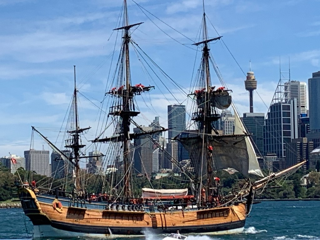 The Watson’s Bay area was lovely. Nice beaches, bars and restaurants, lovely (expensive looking) houses, but a bit too busy for me. After a short while sitting on the steps at the back of the beach we went back to the ferry for the return leg. More great views of the city, this time with a replica of HMB Endeavour (Captain Cook’s ship) sailing in the harbour, along with many (very many) other boats – under both sail and diesel. It all looked a bit chaotic.