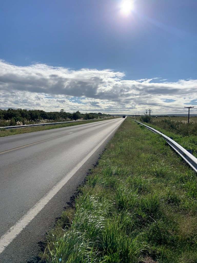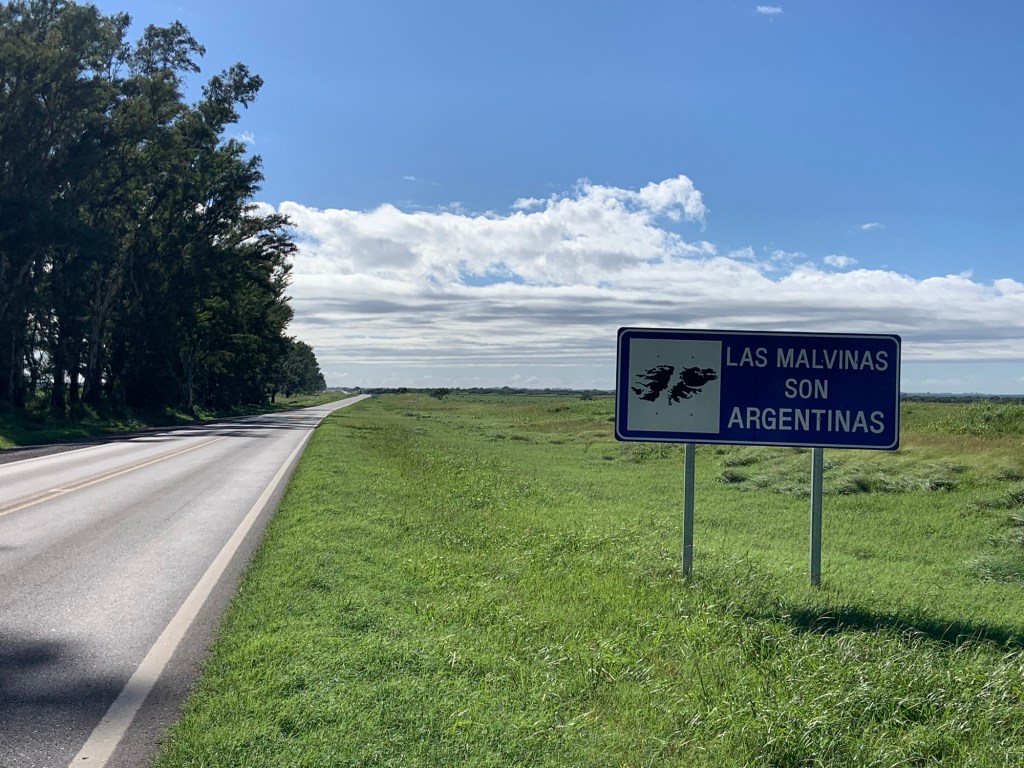 Speed was up a bit from yesterday too. I think the wind wasn’t quite as strong and the road a bit flatter. After 45 kilometres I stopped at a petrol station (as usual) for a coffee and a croissant, and a video call with Jane. A lorry driver came over and said he’d passed me on the road, and wished me luck. A lady sitting at another table asked where I was heading, and wished me the same. People seem genuinely interested in where I am from and what I am doing, and their encouragement and enthusiasm is very uplifting. I had just passed a random sign (in the middle of nowhere) about Las Malvinas. We didn’t discuss it.