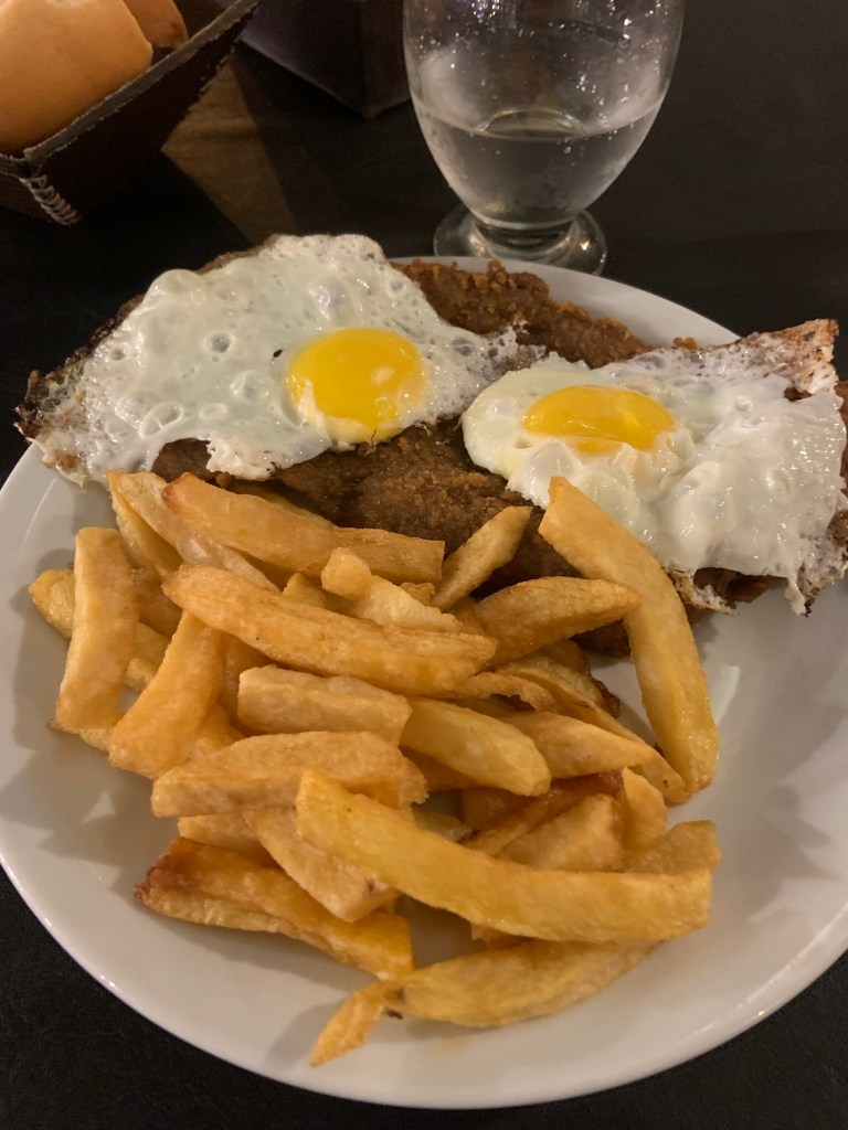 Dinner was at a restaurant / bar about 100m away. Milanese is a breaded piece of thin meat, rather like schnitzel, served with fried eggs. Apparently it’s a local thing. The beef variant I had was tasty but a bit overcooked. I enjoyed it nonetheless.