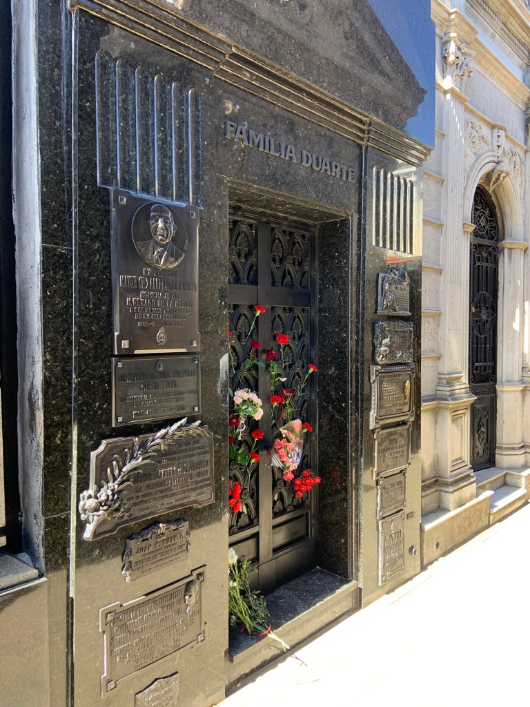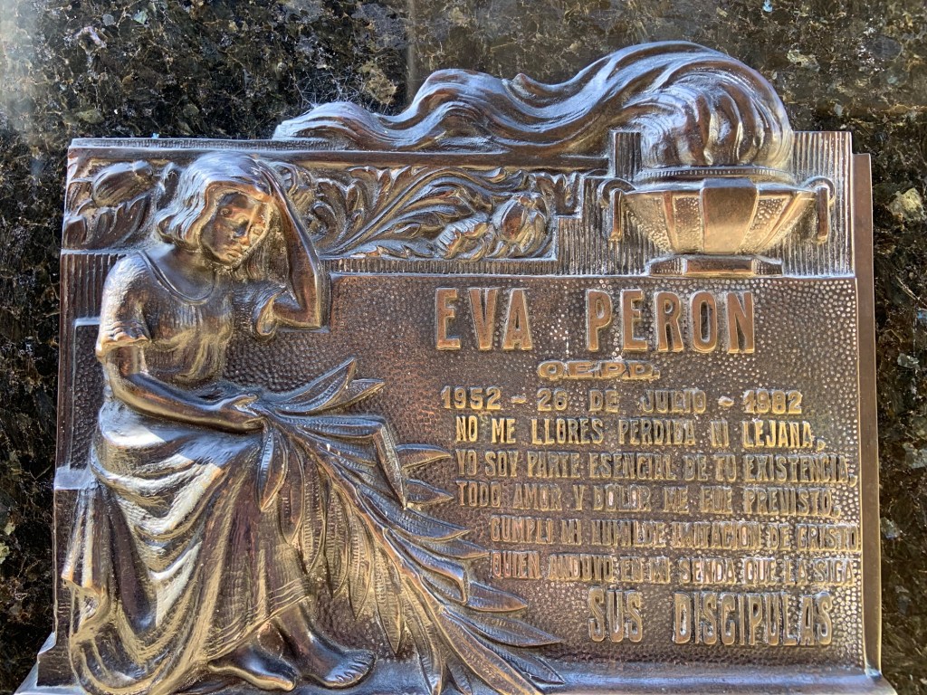 Not knowing any of the names (other than one) on the brochure accompanying their plot numbers, I admired the architecture and enjoyed the peaceful atmosphere of the place. The one name I did know was Maria Eva Duarte – aka Eva Perón. She was interred in her family mausoleum, not her husband’s for some reason. Something of a Princess Diana of her day, due to her popularity she was buried 5m underground to deter grave robbers.
